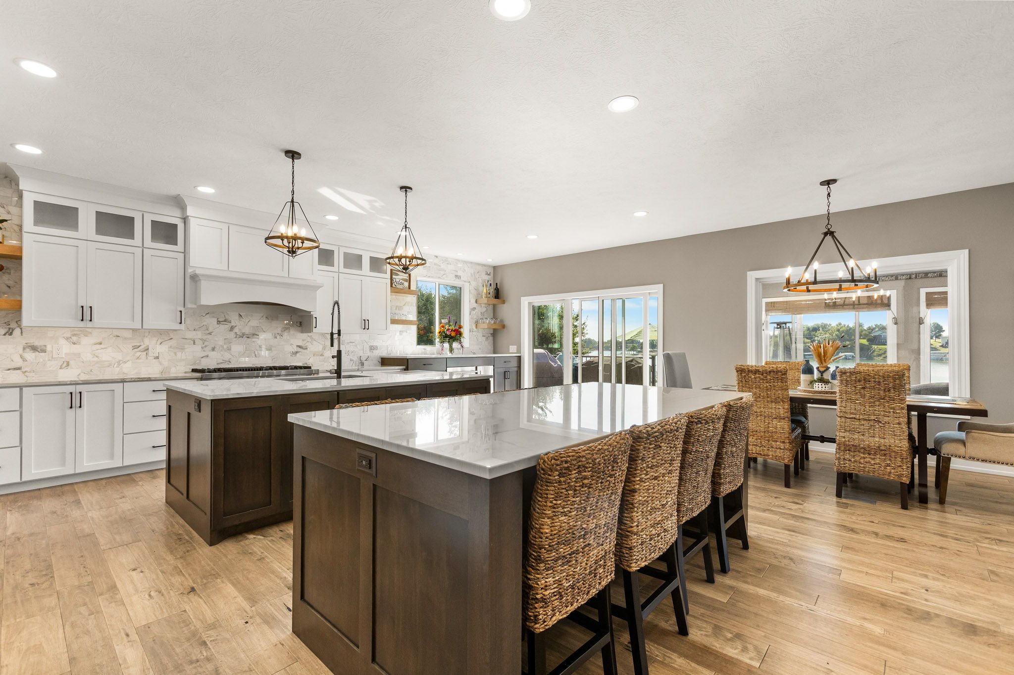 Step inside to discover a recently modernized gourmet kitchen, designed with both style and hosting in mind. Dual islands provide abundant prep and serving space, surrounded by elegant Quartzite countertops, JennAir appliances, a beverage fridge, and a Scotsman ice maker — perfect for keeping drinks cool on hot summer days.