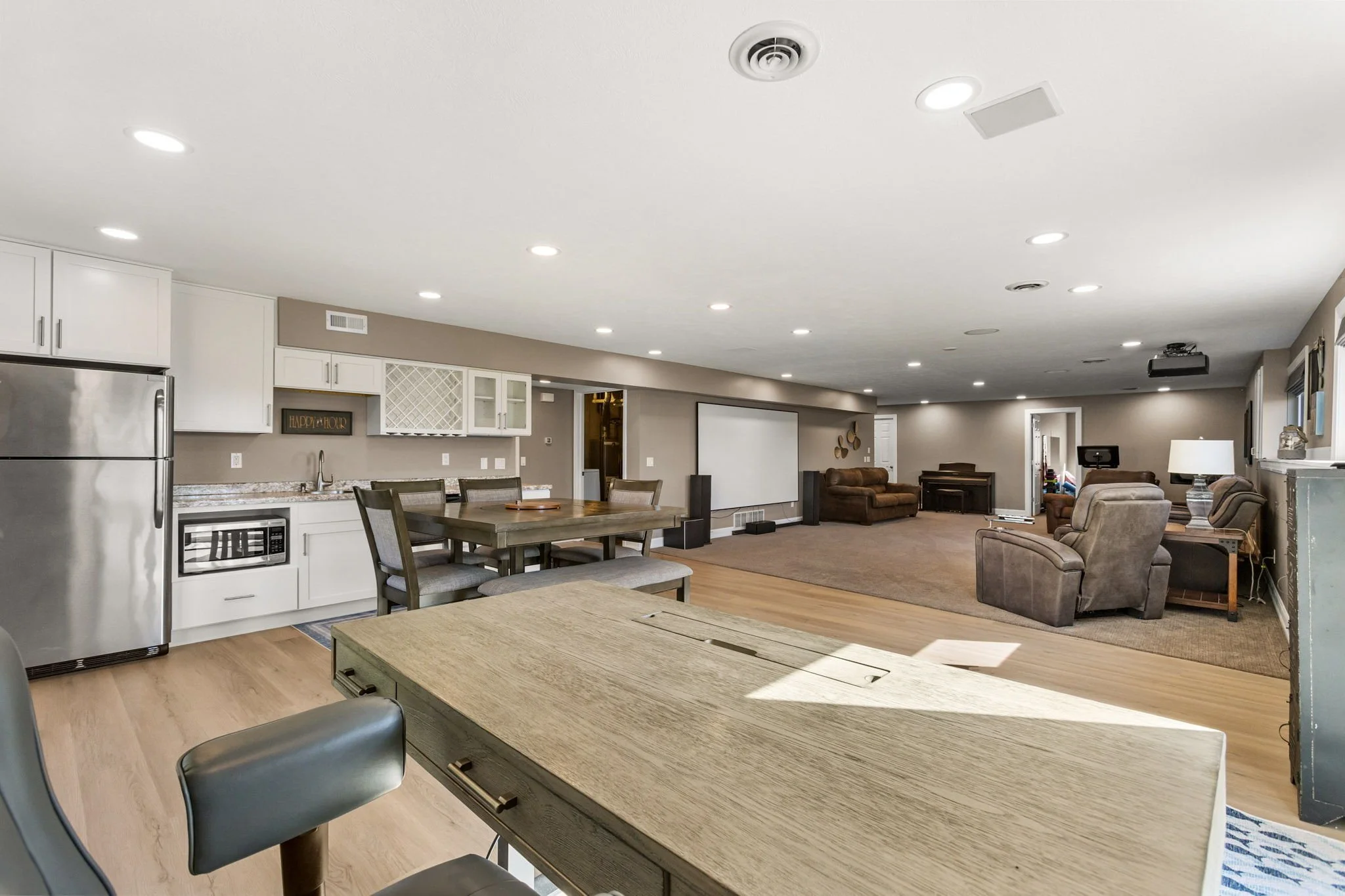 Downstairs, the spacious walkout lower level extends the home’s entertainer appeal. A full wet bar with dishwasher and full-size refrigerator anchors the ultimate hangout zone, complete with a new linear stone fireplace, whole-home audio system, and outdoor speakers for seamless sound inside and out.